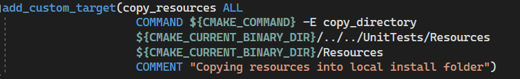 While this does get the job done, it can be very annoying to do this every time you want to add something new to the resource folder. So I began looking into a way to copy over the entire resource folder in one go, and I got about halfway there. I managed to find a way to copy an entire directory with everything inside of it and paste it wherever I wanted, except for the local install folder. Since the install folder is created when the application runs, not when it is built, CMake doesn't have direct access to the install folder. That's why we had to use the "set_property" function above. But I couldn't find a way to use that function along with the "add_custom_target" function that I'm using to copy the whole directory. So, for now, I will just be leaving it in the CMake file and let someone who knows more about CMake than me come along and finish what I started.